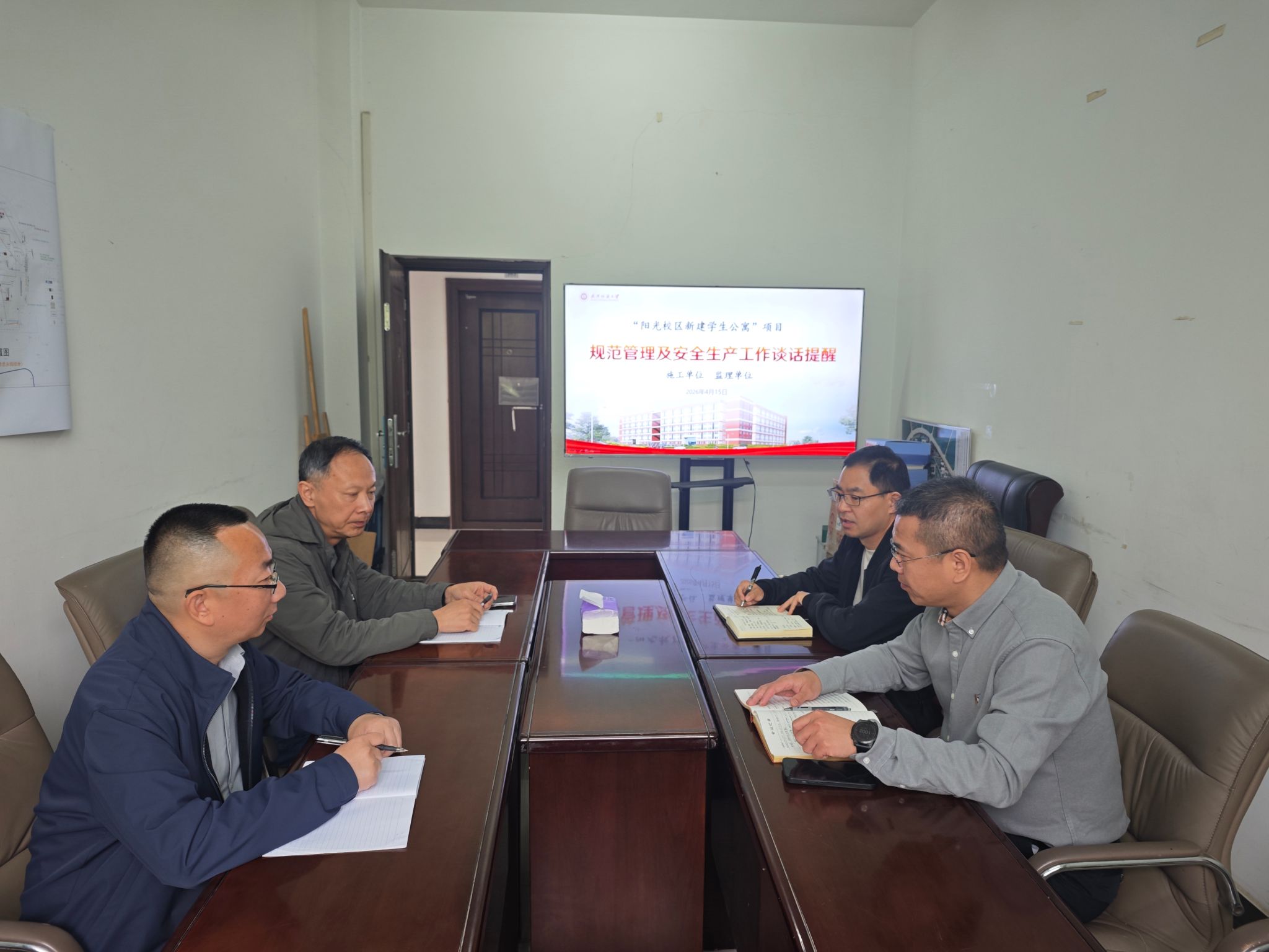2026年4月15日,基建处在后勤楼304会议室召开阳光校区新建学生公寓项目规范管理及安全生产会议,总结项目前期工作进展情况,面向项目施工单位、监理单位负责人开展专题谈话,对项目规范管理、安全生产、廉洁建设等进行工作提示并提出具体要求。基建处武猛、龚俊,项目经理杨文江,总监理工程师张忠诚等参加会议。